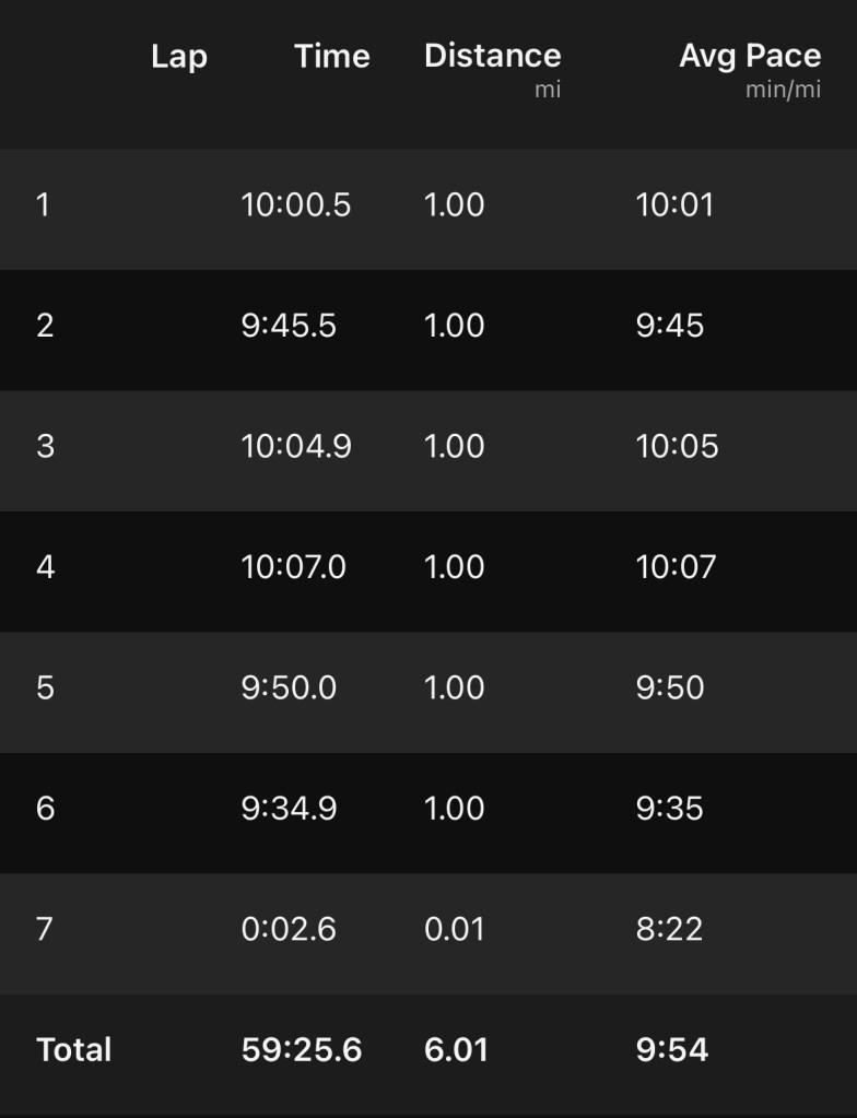 Preparing to run my first marathon. This was the first training day. Today’s run was an easy 6 miles between 8:45 and 10:15 pace. Left upper leg was not too sore today. But definitely could tell I took a full week off from running.
