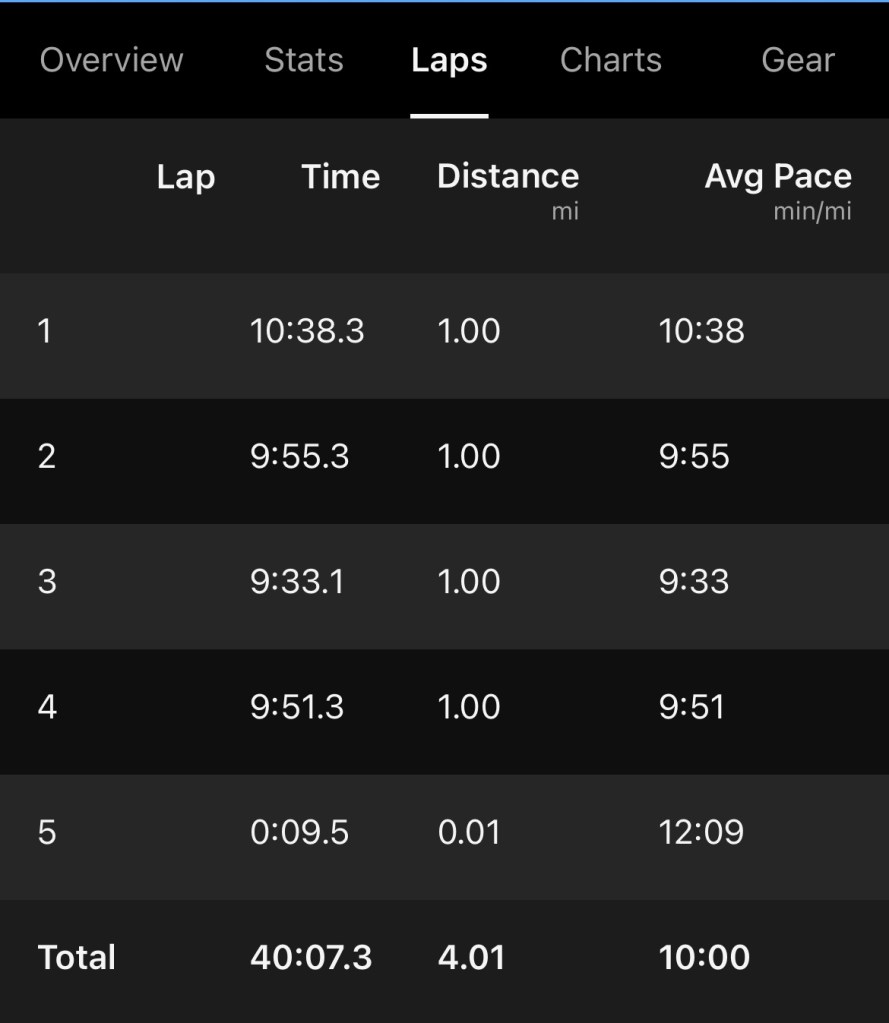 Goal was to run 4 at an easy pace for day between 8:45 and 10:15. Was a little tired today and still making sure some of the problems areas were better. Not a bad day.